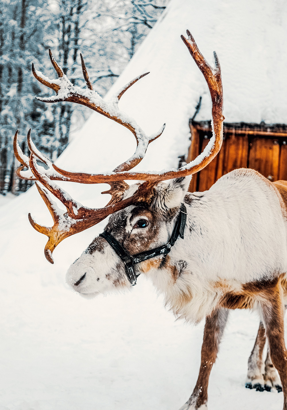 Découvrez cette belle affiche d'un renne majestueux dans la neige, avec ses grandes cornes couvertes de flocons blancs et son pelage brun et blanc.