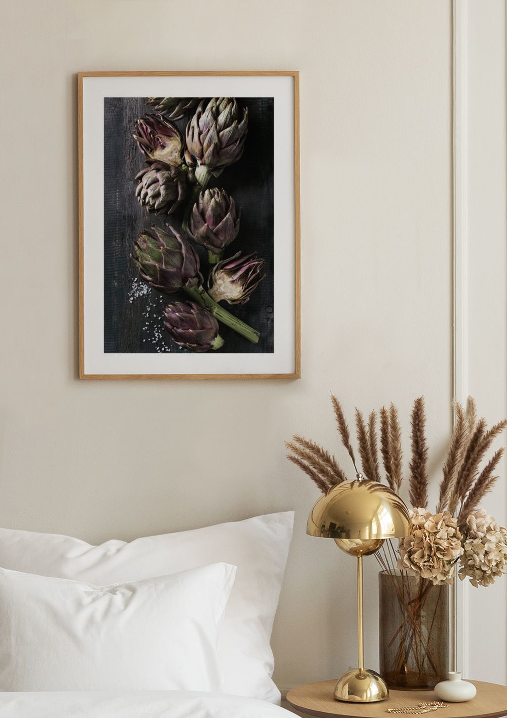 Ce poster d'artichauts verts et violets avec du sel est une décoration murale simple et élégante pour votre cuisine.