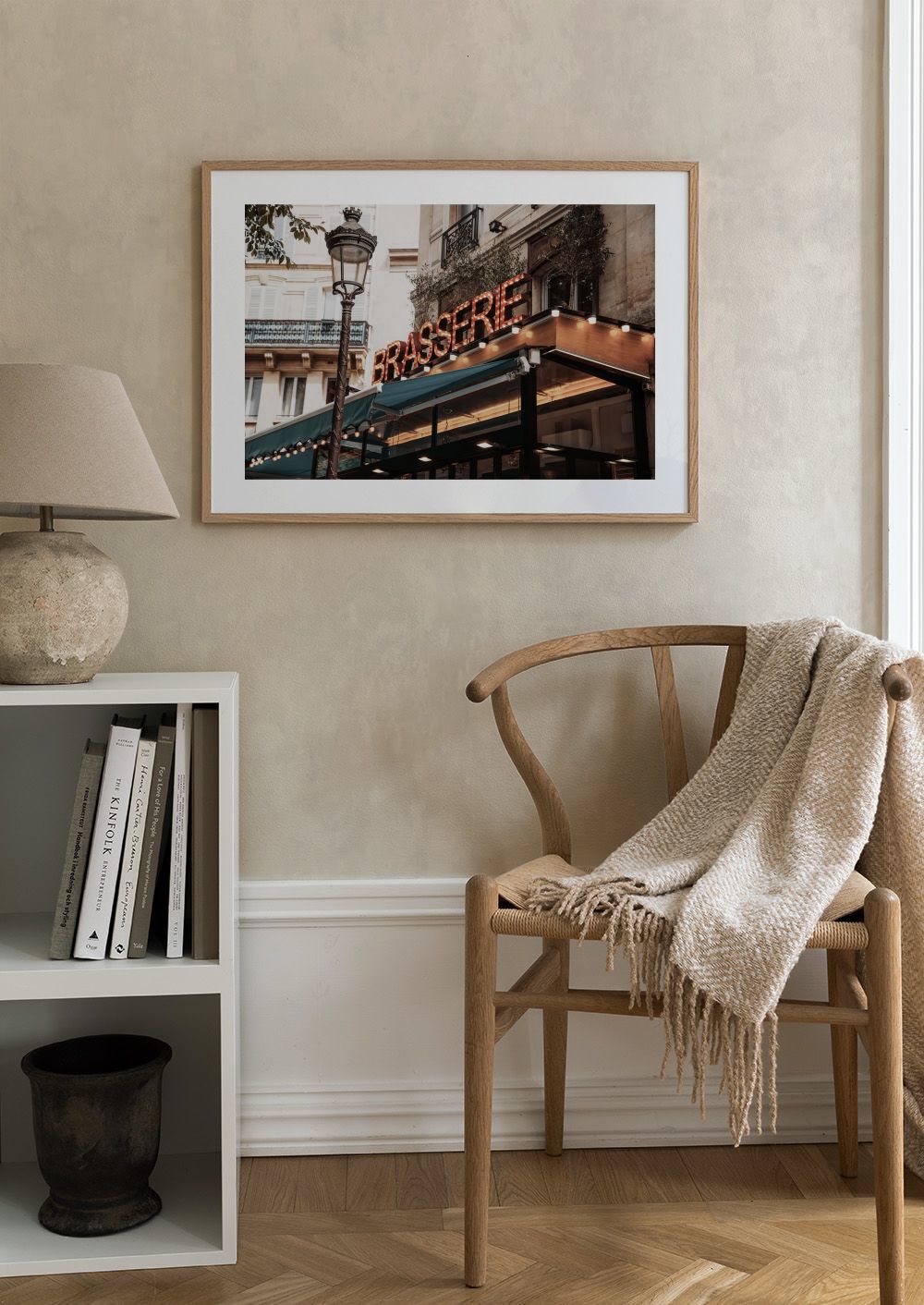 Une affiche vintage avec une enseigne de brasserie illuminée pour apporter une ambiance parisienne chaleureuse à votre intérieur.