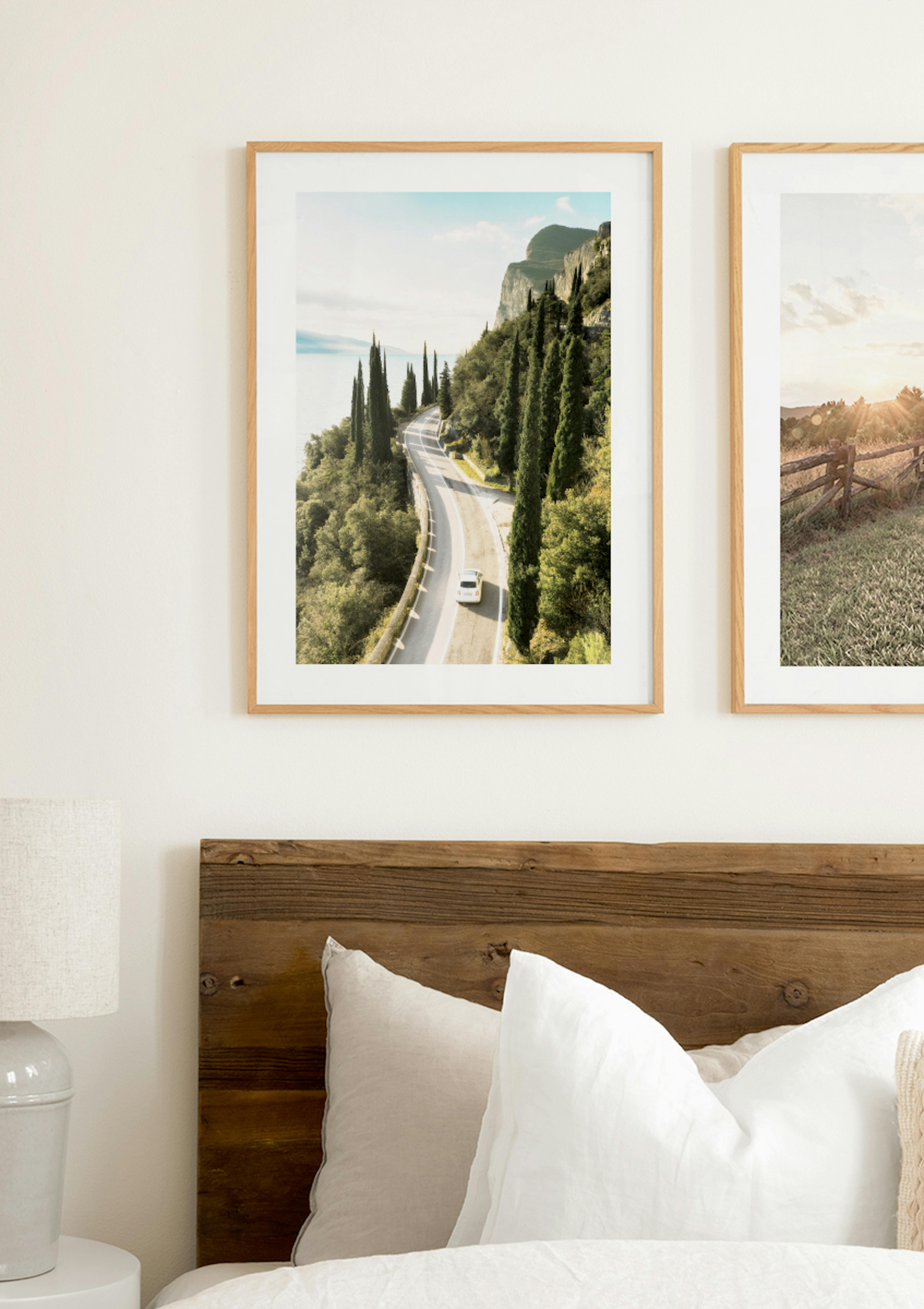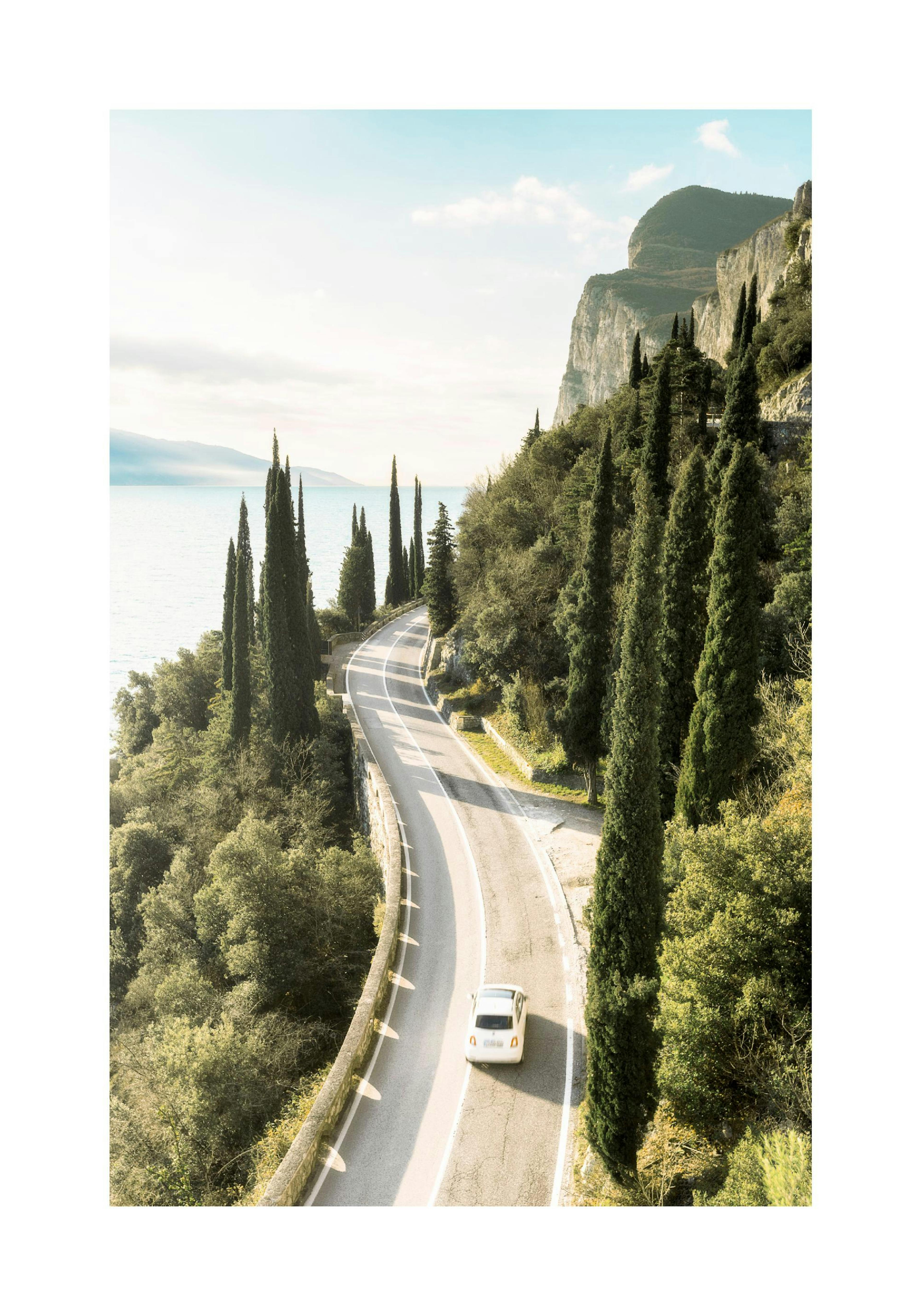 Fantastique affiche de paysage montrant une voiture sur une route panoramique le long du lac de Garde dans la région de Tremosine sul Garda en Italie. La route serpente le long des rives du lac de Garde, devant des rochers et des arbres, toujours avec une vue sur l'eau cristalline. Décorez votre maison avec des posters de paysages riches en couleurs, en paillettes et en beauté naturelle.
