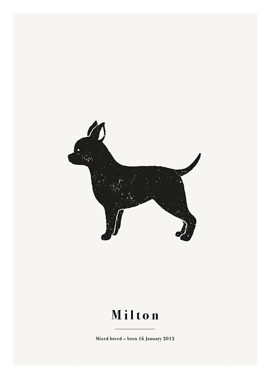 Illustration d’un chihuahua noir avec des taches blanches sur un fond gris clair avec du texte en bas. Des affiches personnalisées vous permettent de personnaliser votre affiche en ajoutant vos propres texte, noms ou dates. C’est une façon amusante de personnaliser votre propre art ou d’offrir un cadeau à quelqu’un.