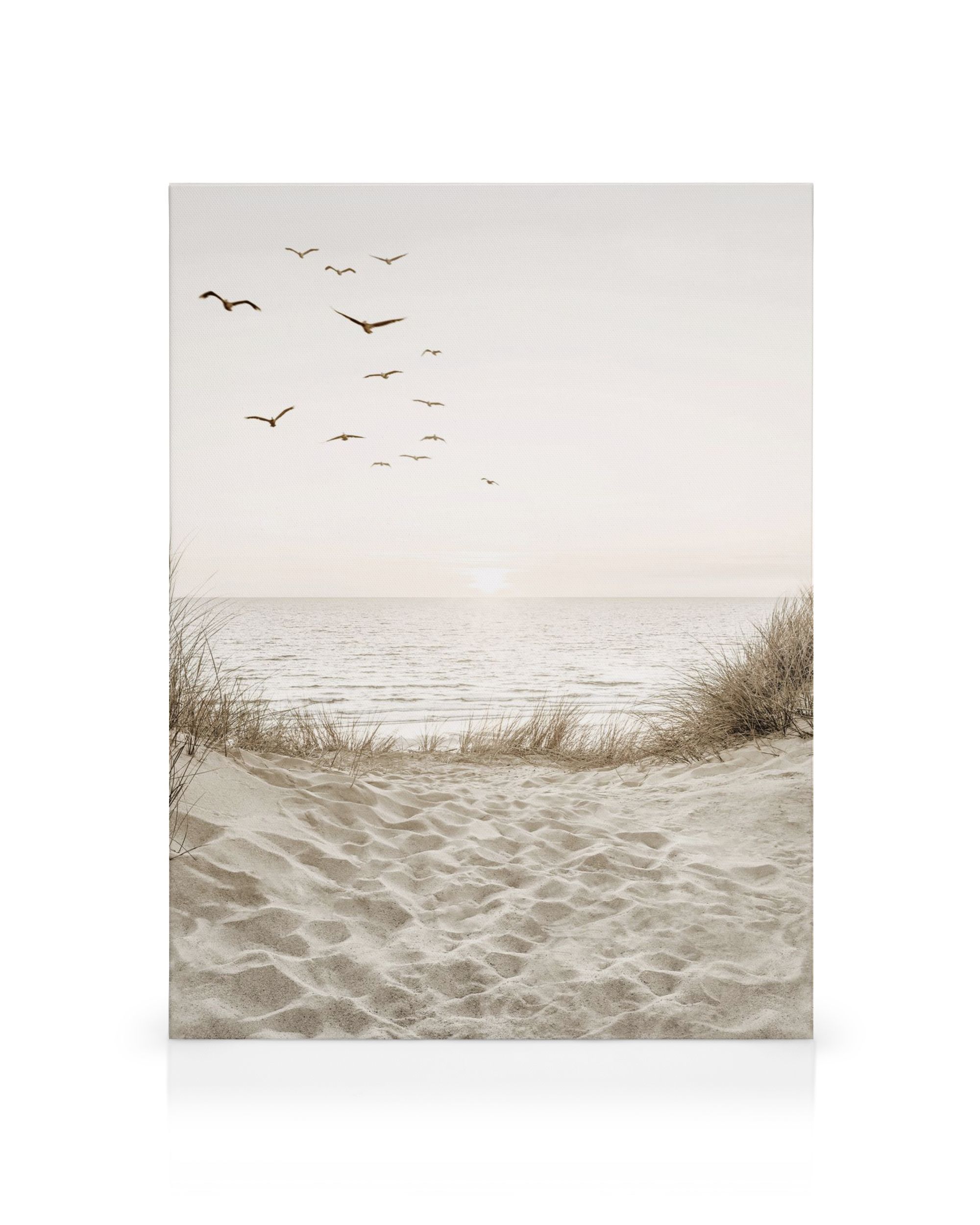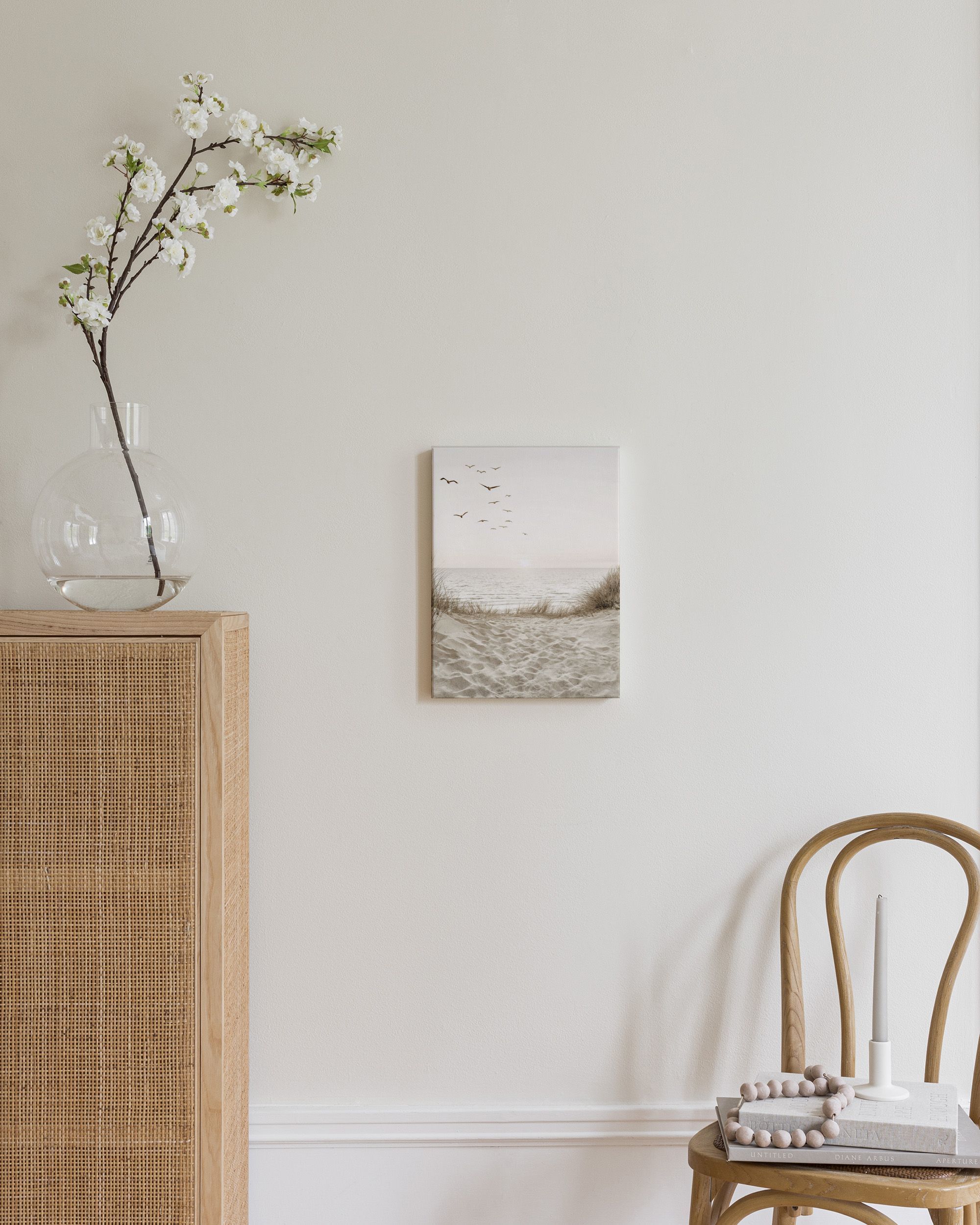 À partir de 7,77 €Toile murale sereine montrant des dunes de sable ondulées et des oiseaux volant dans le ciel, dans des couleurs tan et blanc atténuées. Une scène apaisante parfaite pour votre décoration murale.