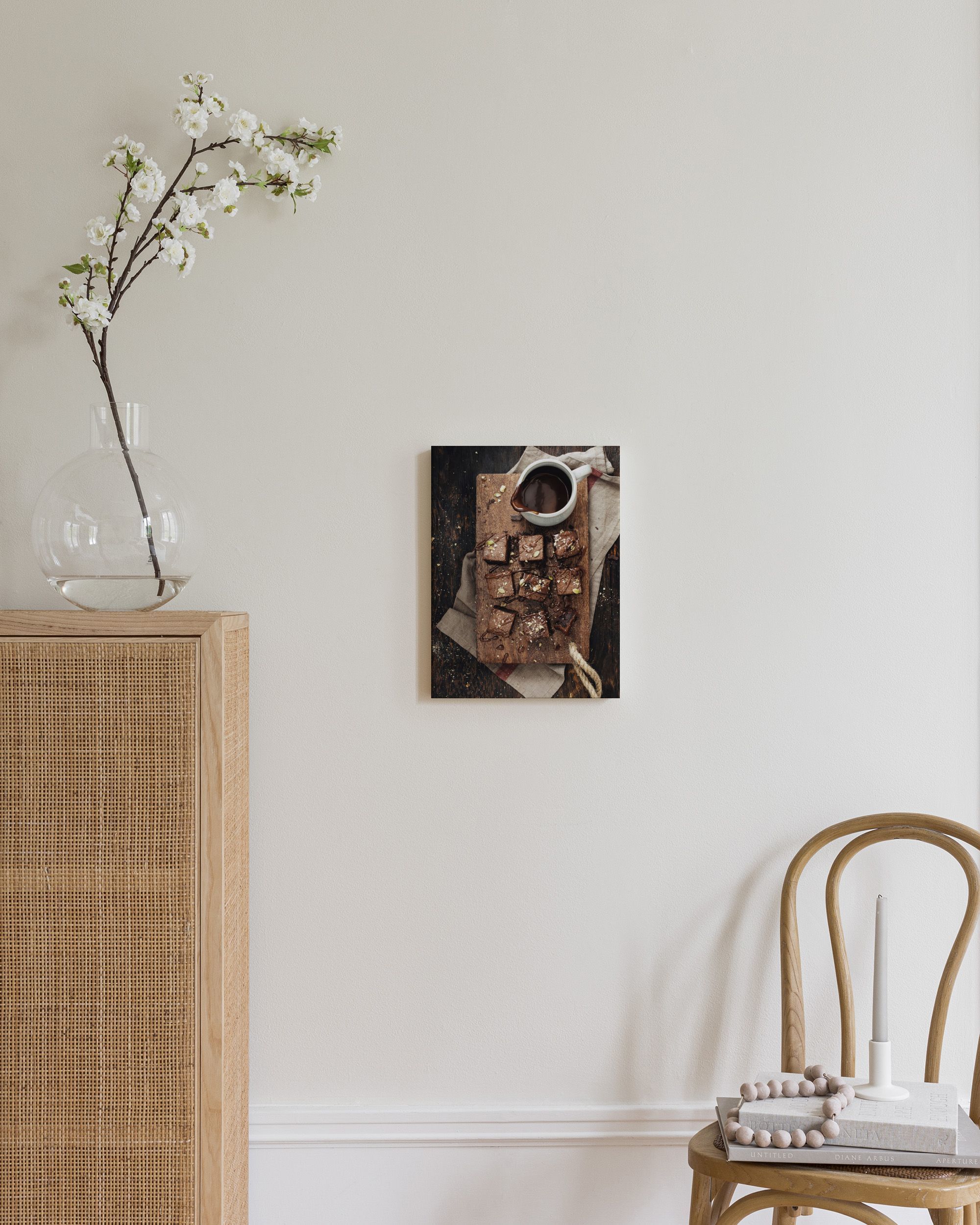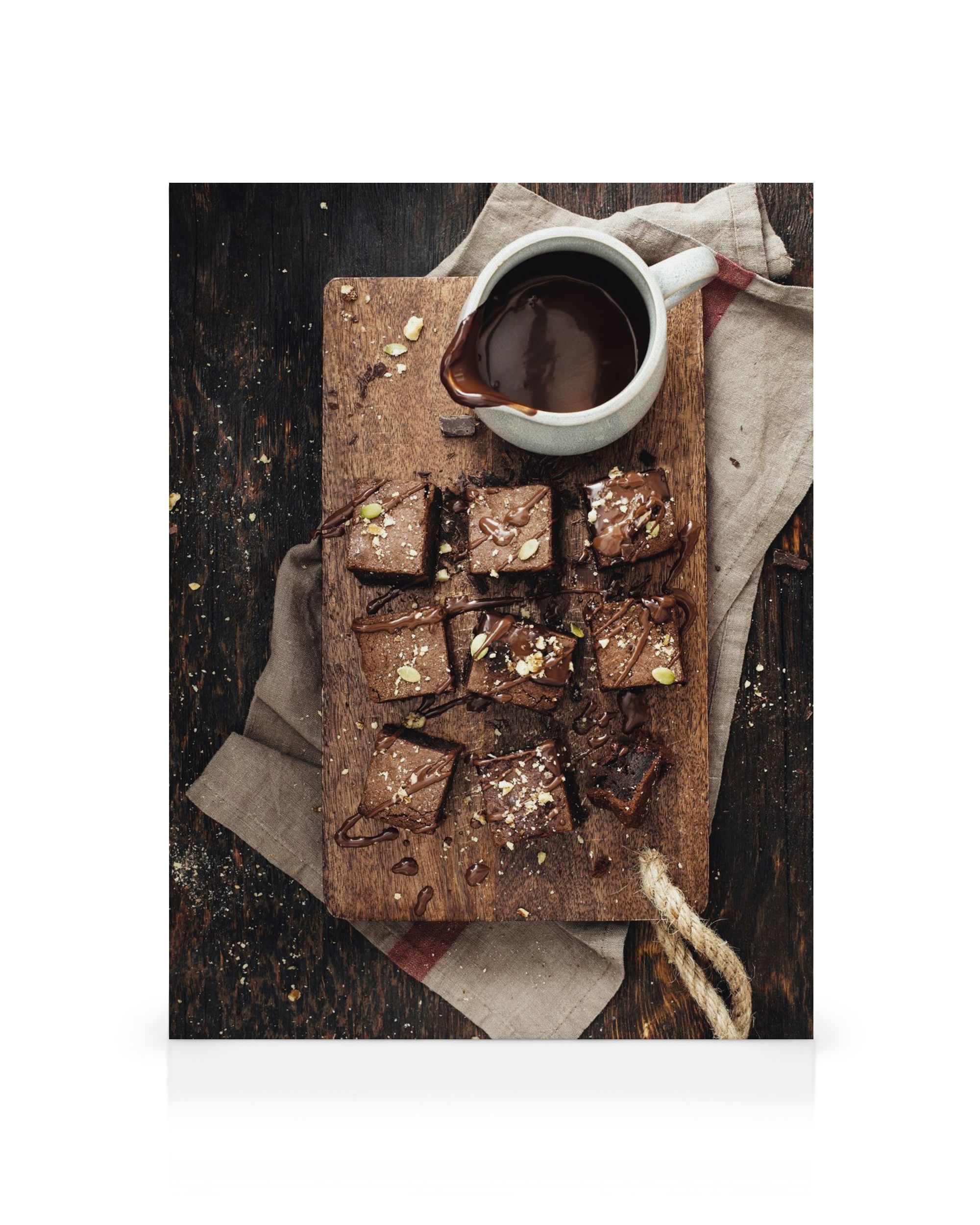 Savourez ces délicieux brownies au chocolat, coupés en carrés parfaits et garnis de chocolat fondu et de noix croquantes sur une planche en bois.
