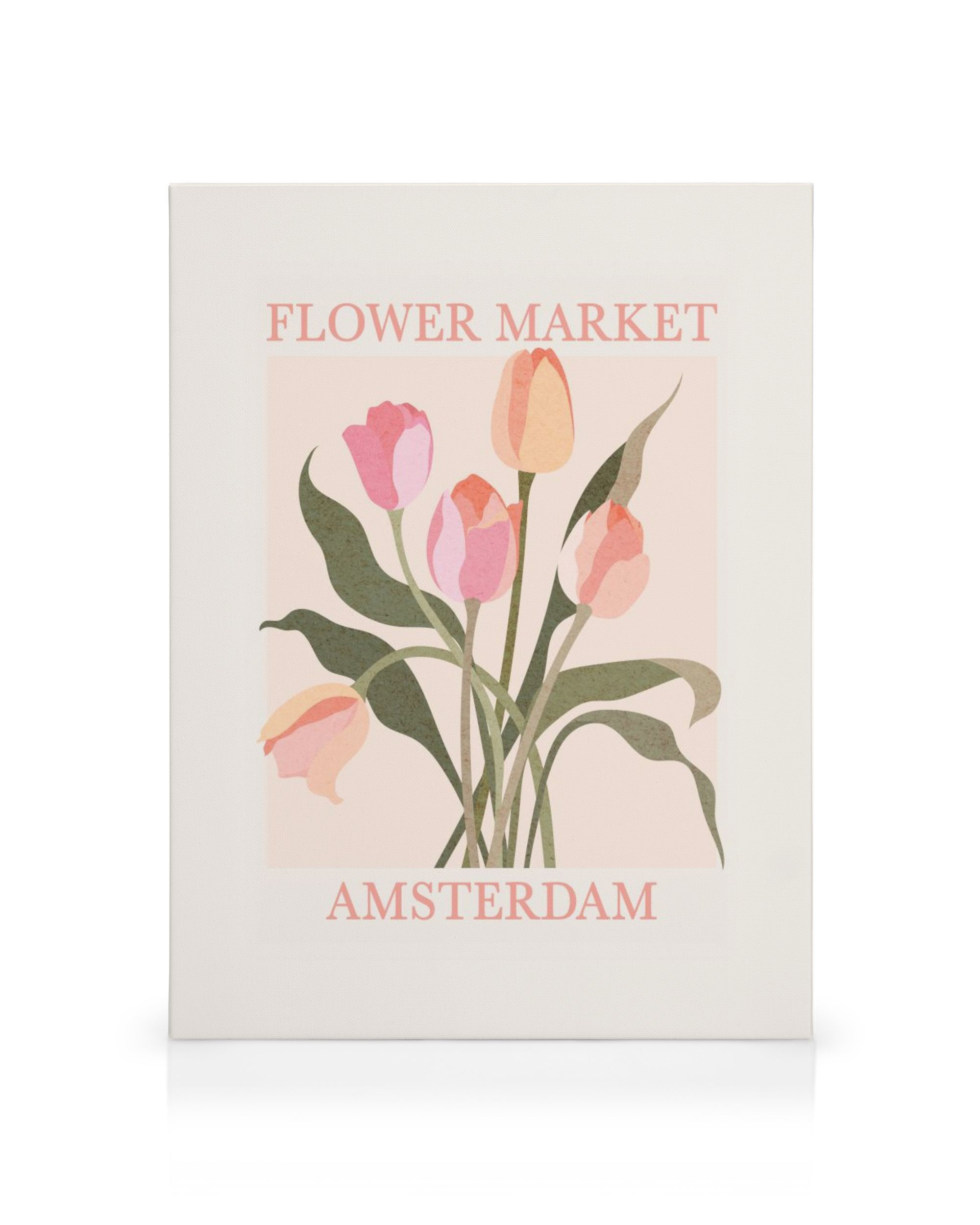 À partir de 12,95 €Cette toile montre le marché aux fleurs d'Amsterdam avec des tulipes roses et orange sur fond beige. Les fleurs se mêlent aux feuilles vertes pour créer une belle image.